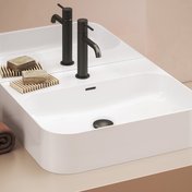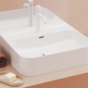 La vasque est conçue pour être placée sur un plan de travail ou sur un meuble. Sa forme lui permet d’être placée contre le mur. Les lignes droites sont légères et s’intègrent parfaitement dans un intérieur moderne.