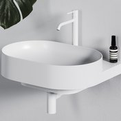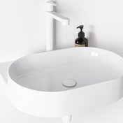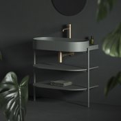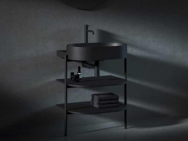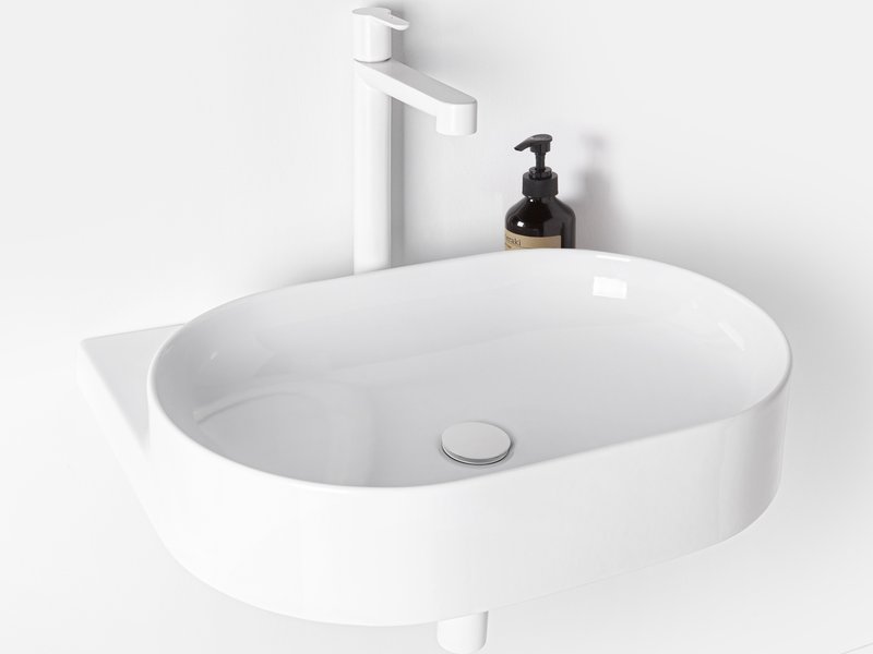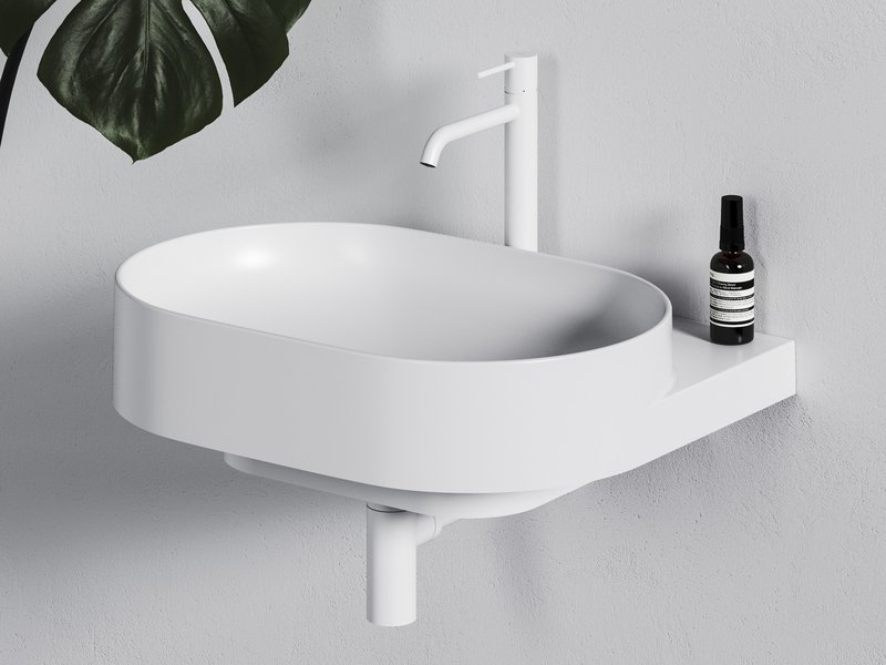 La vasque ovale est complétée par un élément de design sous la forme d’une console de fixation en blanc, noir ou acier inoxydable. La console, le mitigeur, le siphon et la bonde forment un ensemble élégant au ton unique.