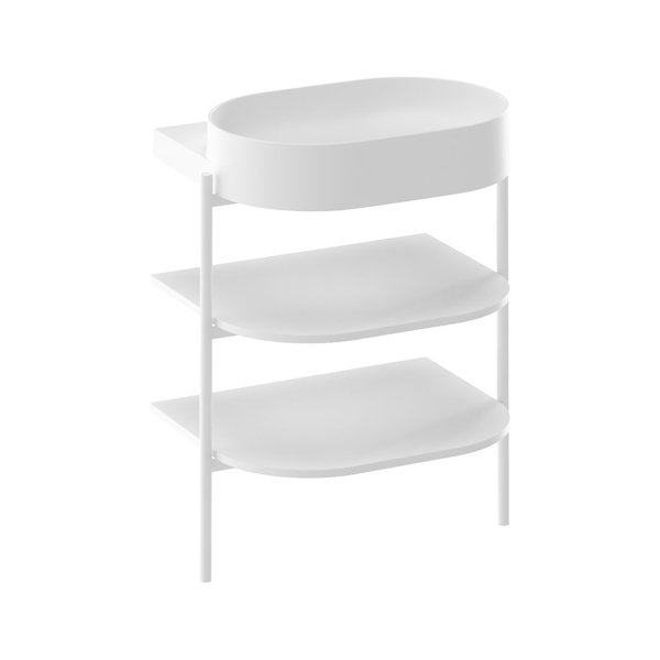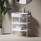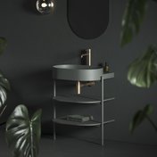 Le meuble ouvert Yard est une structure métallique stable complétée de deux étagères. La conception métallique à étagères CS Yard est spécialement conçue pour les vasques design Yard 40 / 60 / 80. Cette conception est dotée d’un trou pour le siphon et de pieds à bloquer. Les étagères copient parfaitement la forme de la vasque et proposent un espace de rangement suffisamment grand. La partie haute des pieds métalliques dépasse légèrement, offrant une solution parfaite pour suspendre une serviette de toilette.